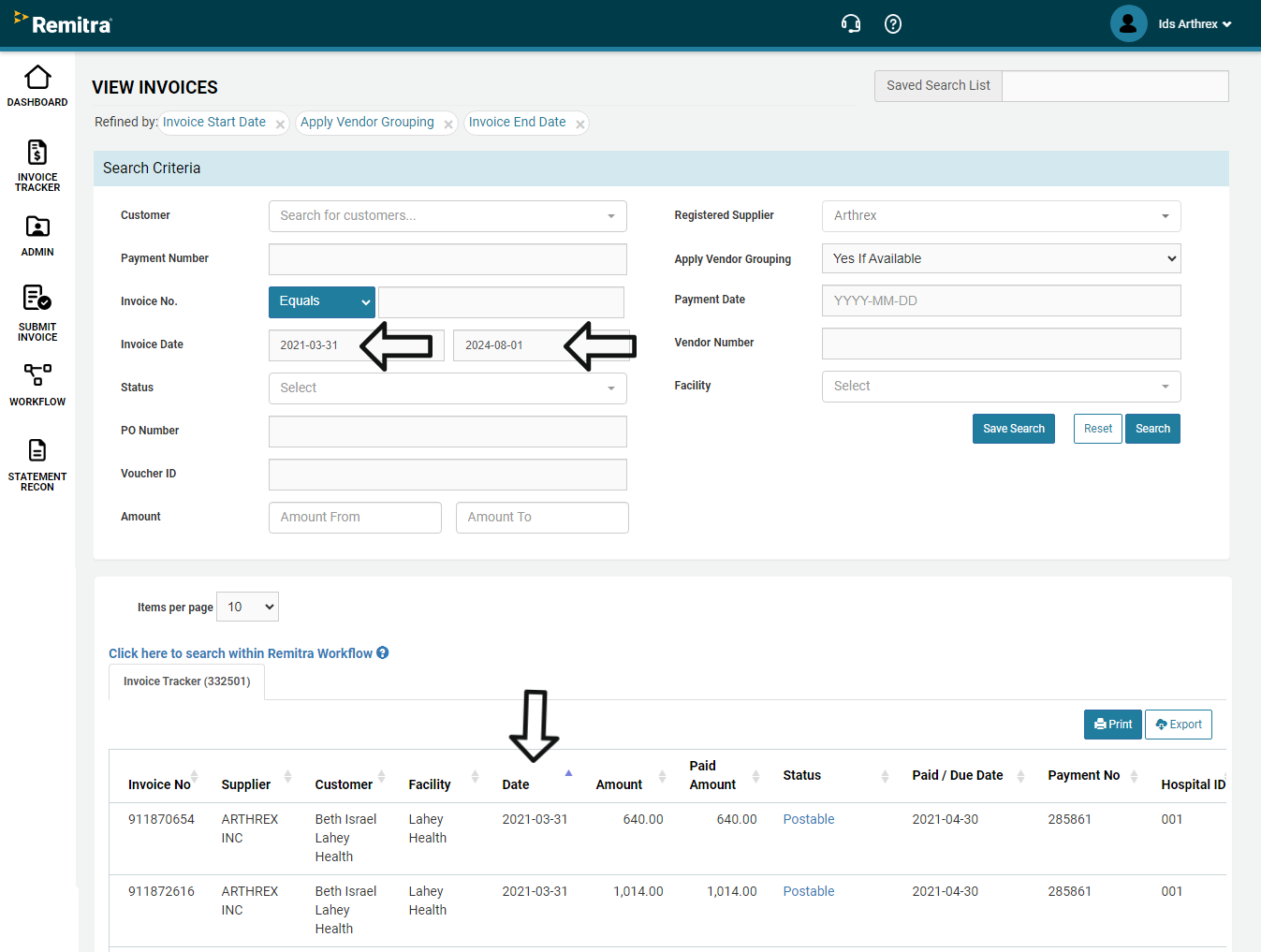 A supplier can view the total number of outstanding invoices (in brackets) at each facility. Then a supplier can drill down by facility or invoice number or a date range.